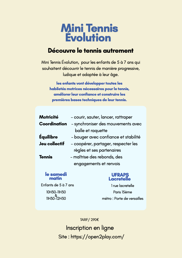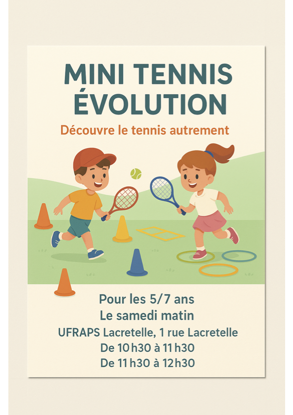 Mini Tennis Évolution, pour les enfants de 5 à 7 ans qui souhaitent découvrir le tennis de manière progressive, ludique et adaptée à leur âge. Les enfants vont développer toutes les habiletés motrices nécessaires pour le tennis, améliorer leur confiance et construire les premières bases techniques.